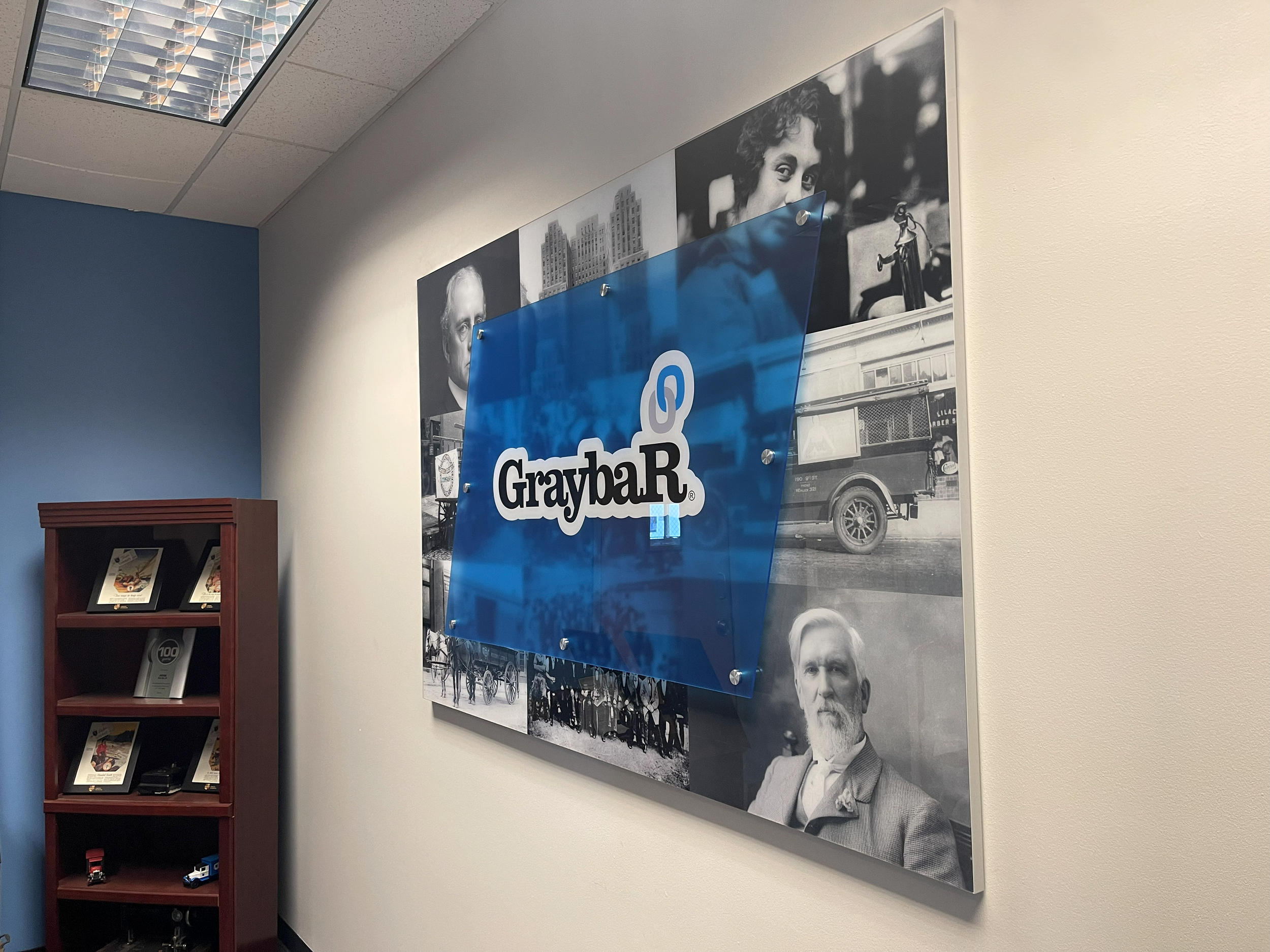 We achieved our goal by designing a dimensional piece that subtly incorporates GraybaR’s history in black and white behind blue acrylic that perfectly matches the GraybaR logo color. The colored acrylic is secured by stainless steel standoffs, which complement the outer edges of the piece, creating a harmonious balance and delivering a beautiful, polished final result.